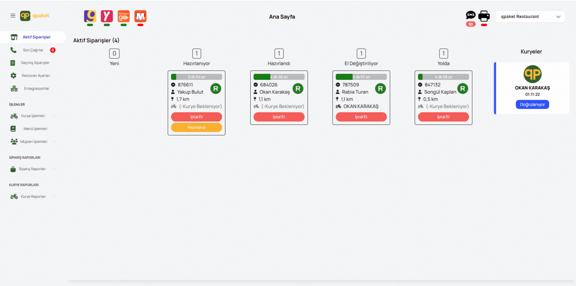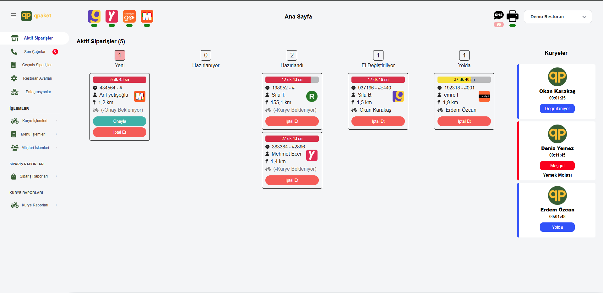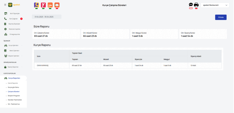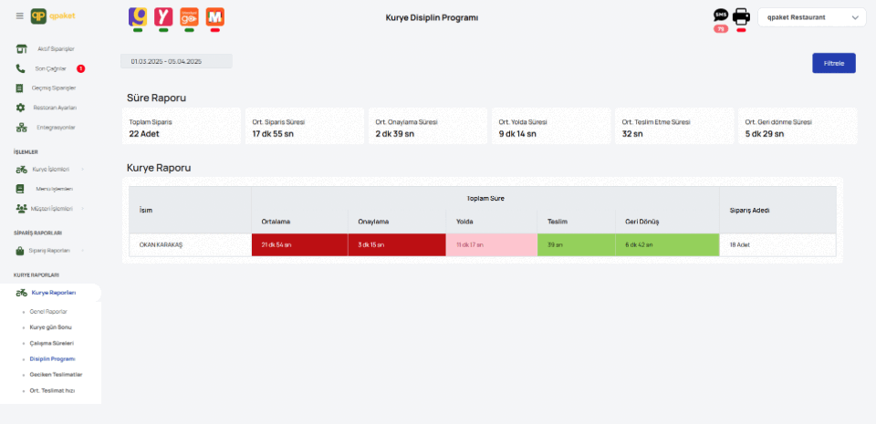 Getir'den Yemeksepeti'ne tüm siparişleri ve kuryeleri canlı takip edin. Kurye süresi, yoğunluk analizi ve gecikme uyarılarıyla verimliliği artırın. qpaket ile işinizi büyütün, operasyonu kolaylaştırın..